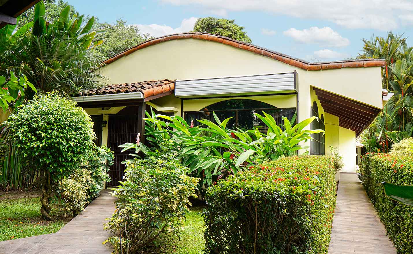 Lush tropical landscaping with palm trees, hibiscus, and fruit trees