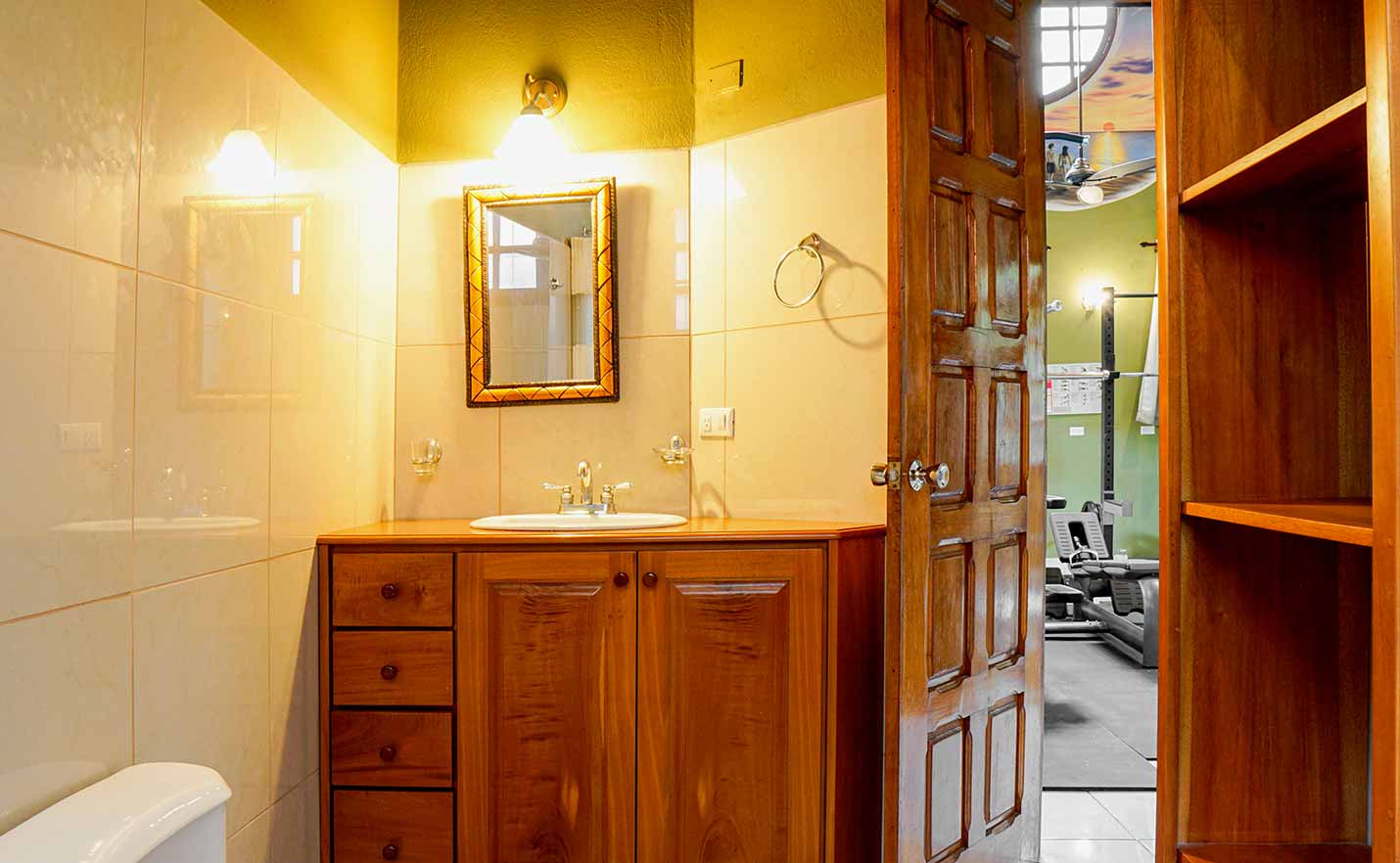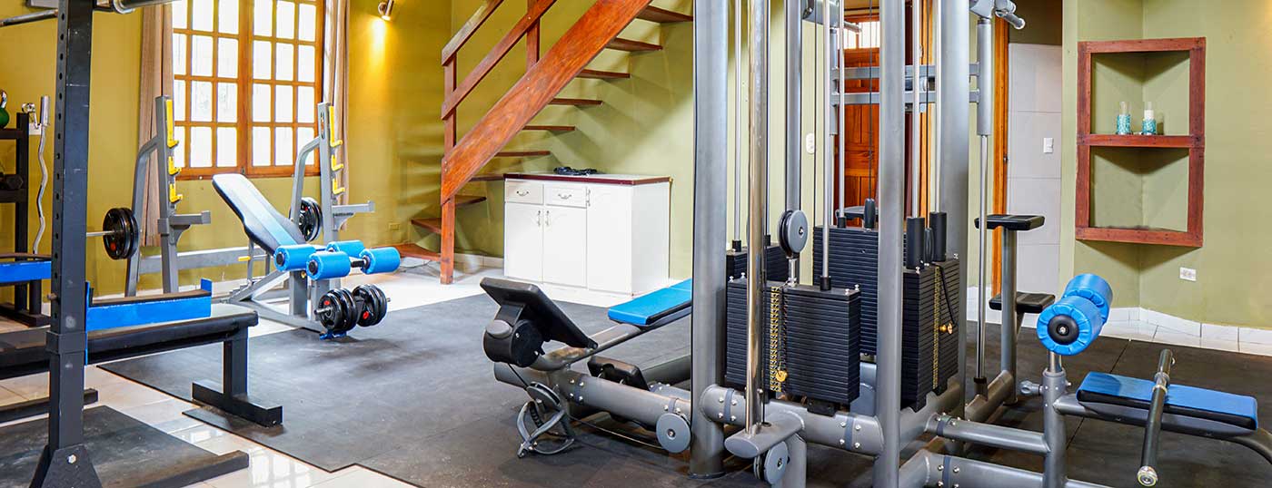 The private gym features commercial-grade equipment, with space for yoga/meditation studio